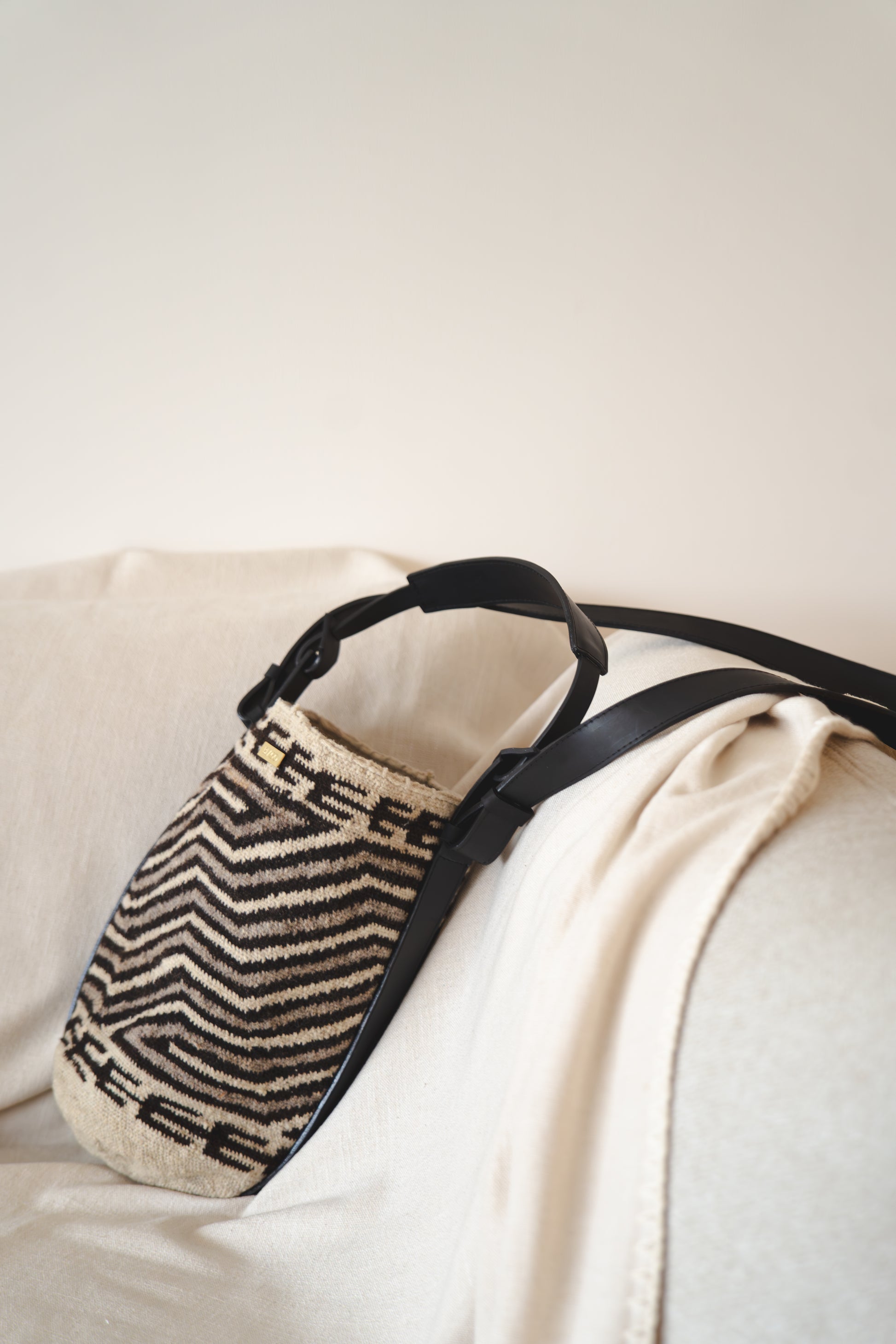 Blago valora los saberes ancestrales a través de una labor realizada 100% a mano utilizando la lana de ovejo e interviniéndolas con cuero de la más alta calidad, lo cual las hacen más versátiles, sin perder de vista que la pieza principal siempre es la mochila arhuaca, como tributo a las mujeres quienes culturalmente son quienes tejen, teniendo en cuenta que las mochilas (tutu, en arhuaco), son la representación del vientre materno que lo contiene todo.