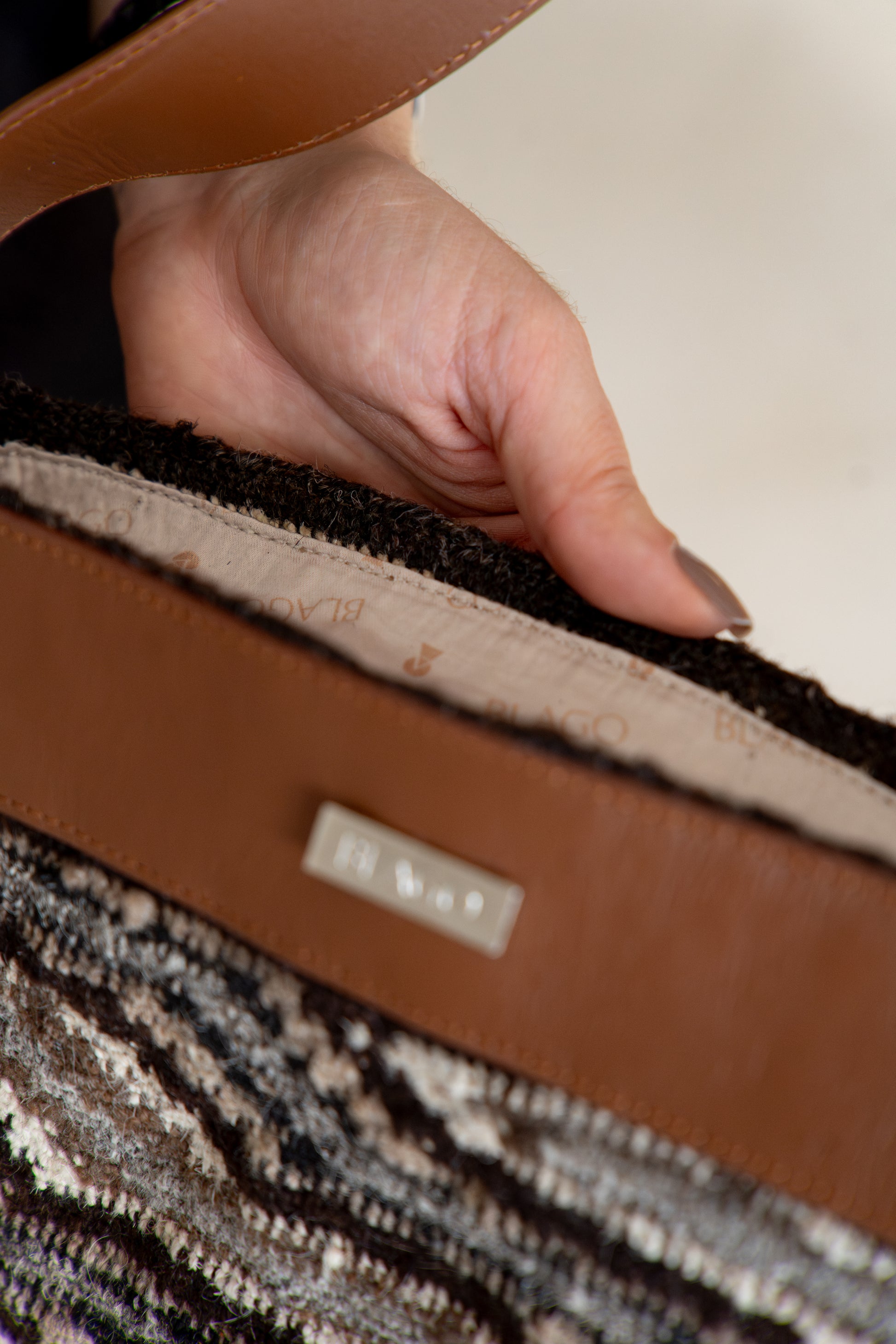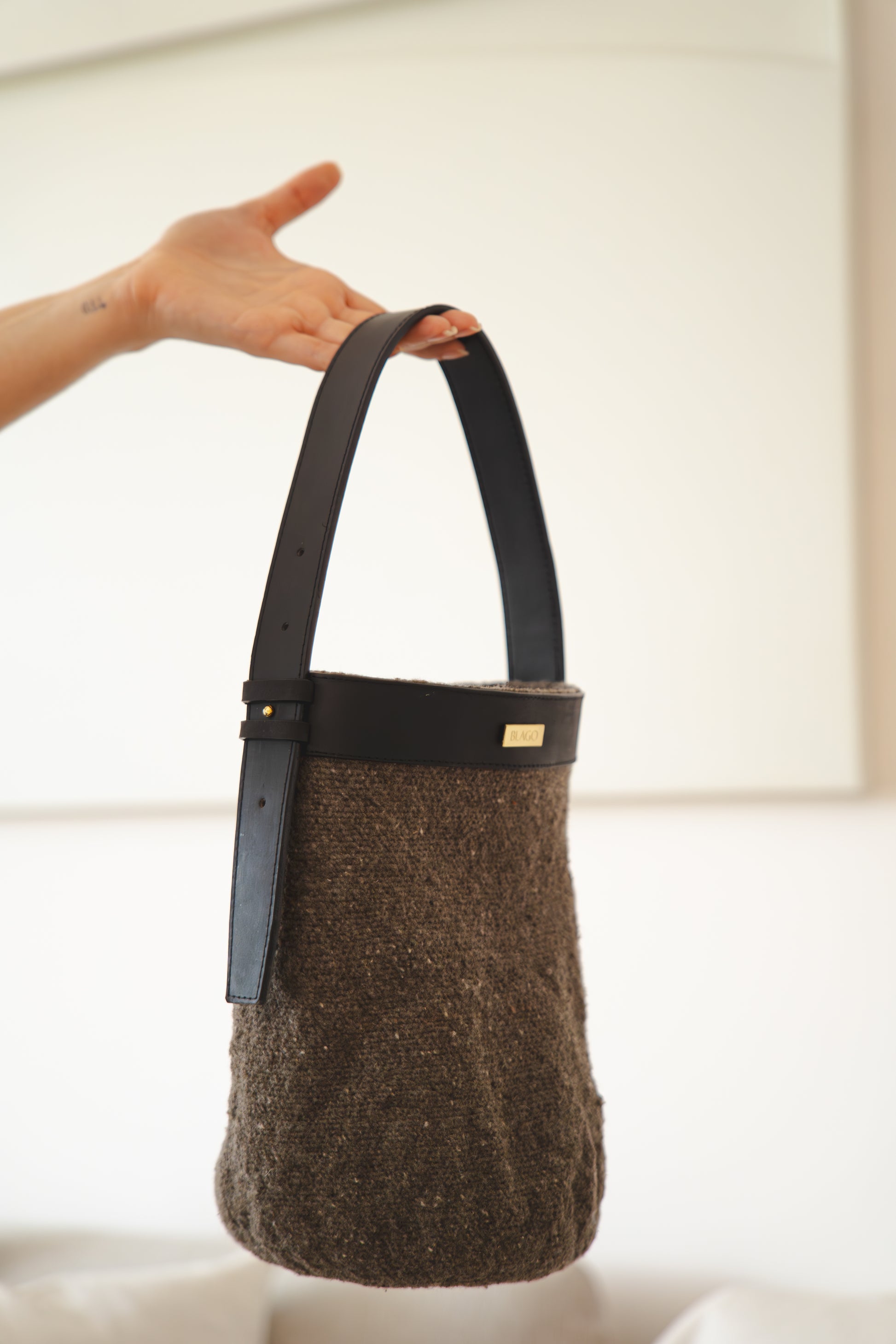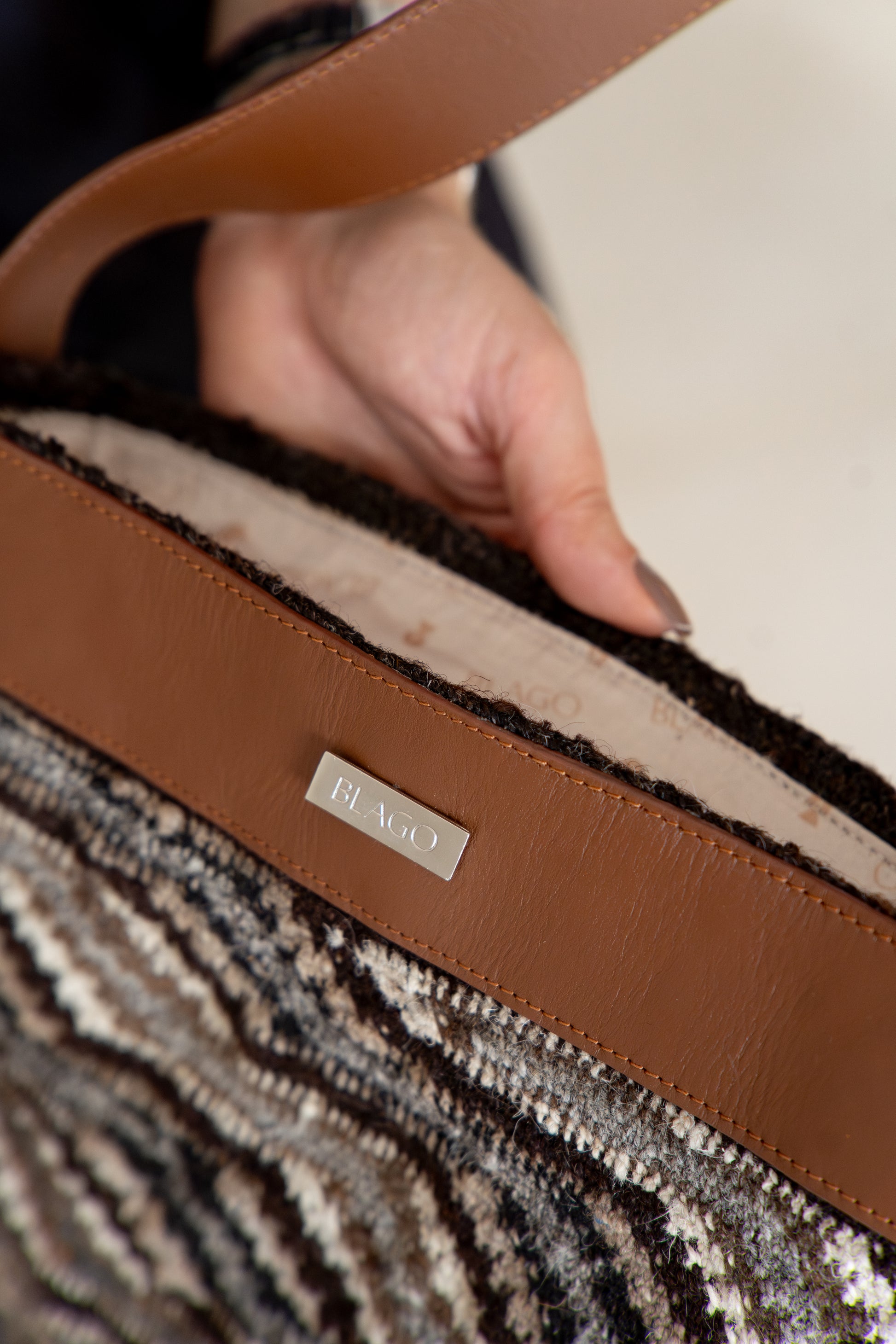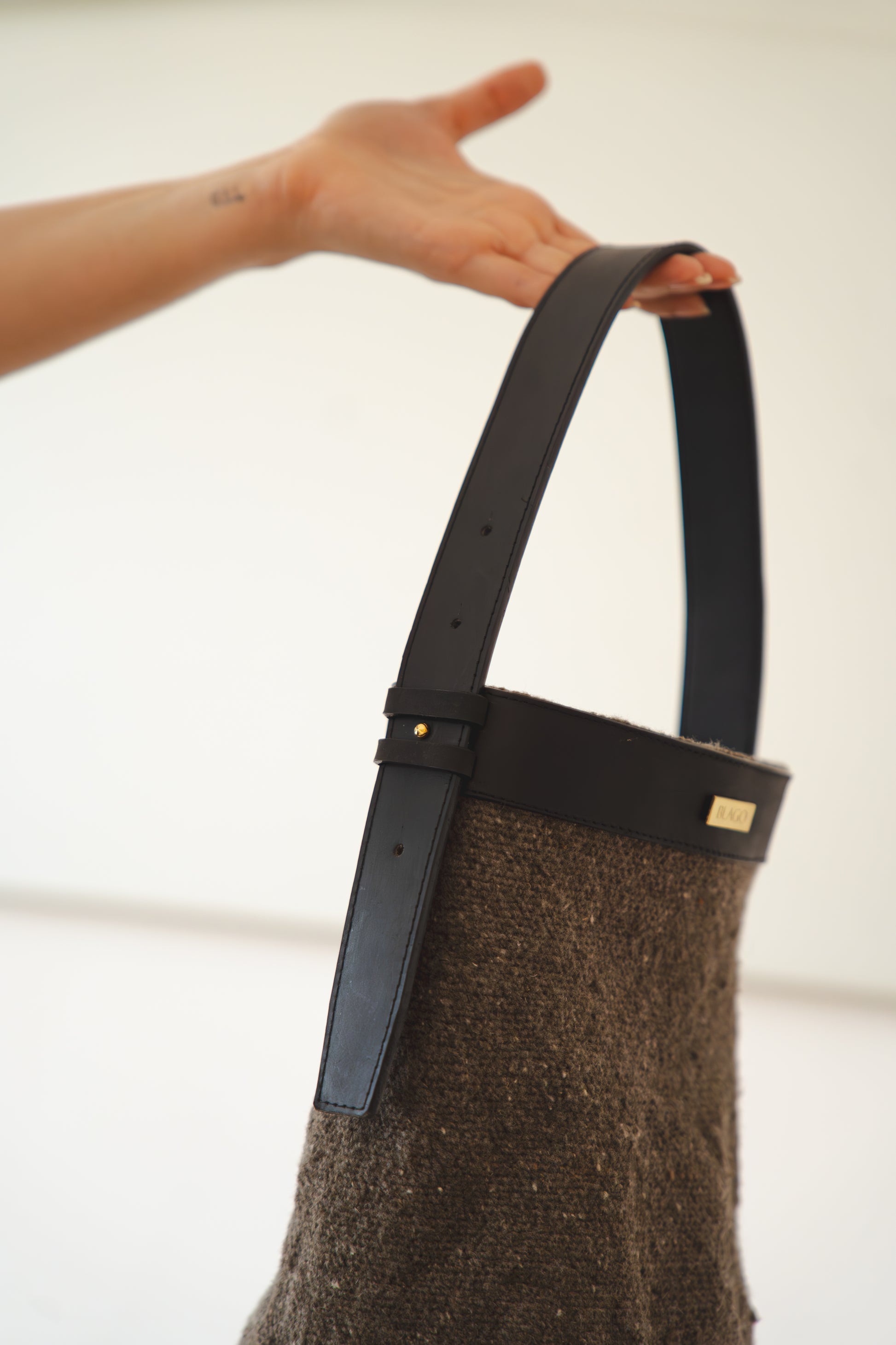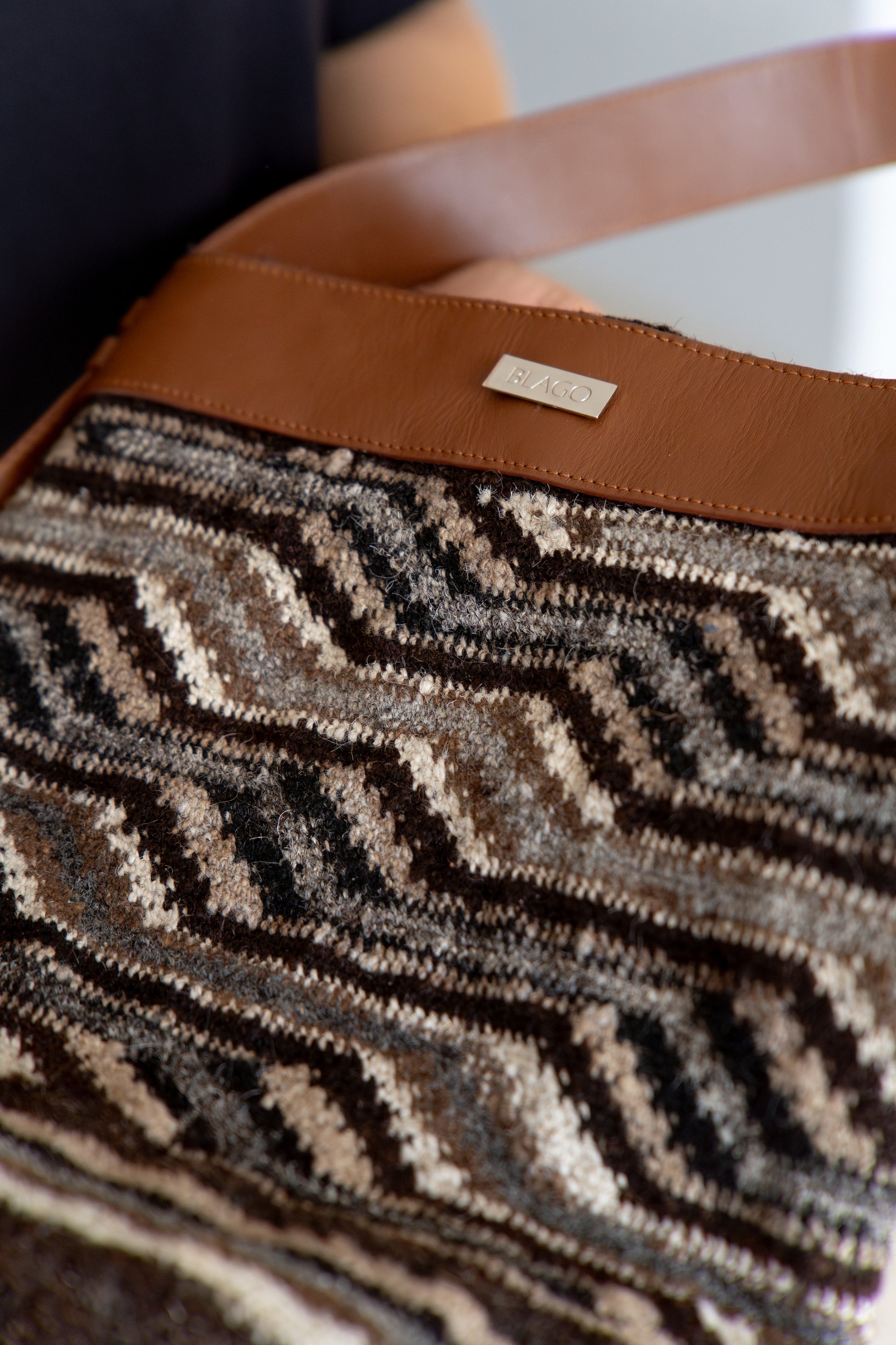 Blago valora los saberes ancestrales a través de una labor realizada 100% a mano utilizando la lana de ovejo e interviniéndolas con cuero de la más alta calidad, lo cual las hacen más versátiles, sin perder de vista que la pieza principal siempre es la mochila arhuaca, como tributo a las mujeres quienes culturalmente son quienes tejen, teniendo en cuenta que las mochilas (tutu, en arhuaco), son la representación del vientre materno que lo contiene todo.